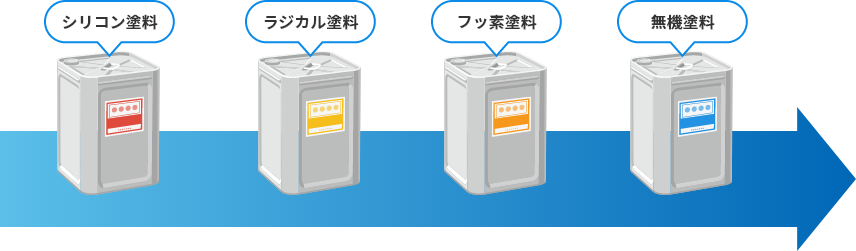 一般的な塗料種類の耐候性の高さの比較です。右に行くほど耐候性が高くなります。こちらの比較はあくまで目安のため、塗料の種類によってはこの比較とは異なる場合があります。
