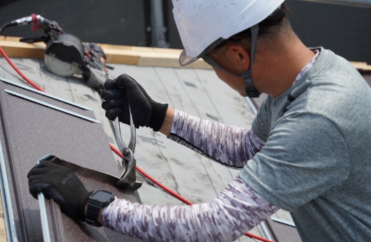 本体をすべて張り終えた後、棟板金を取り付けて施工完了となります。